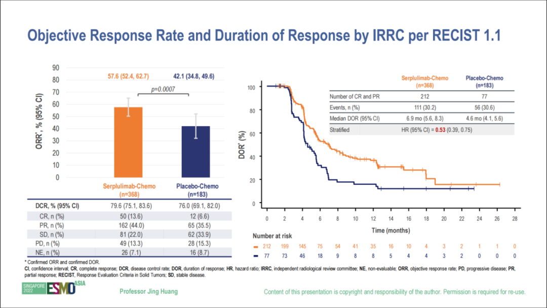 次要終點方面,斯魯利單抗聯合化療組的ORR較安慰劑聯合化療組顯著改善(圖5)。總人群由獨立影像評估委員會(IRRC)評估,並經過確認的ORR(Confirmed ORR)分別為57.6%(50例完全緩解+162例部分緩解)vs 42.1%(12例完全緩解+65例部分緩解),差異具有統計學意義(p=0.0007);中位DoR分別為6.9m vs 4.6m(HR=0.53,95% CI 0.39-0.75)。