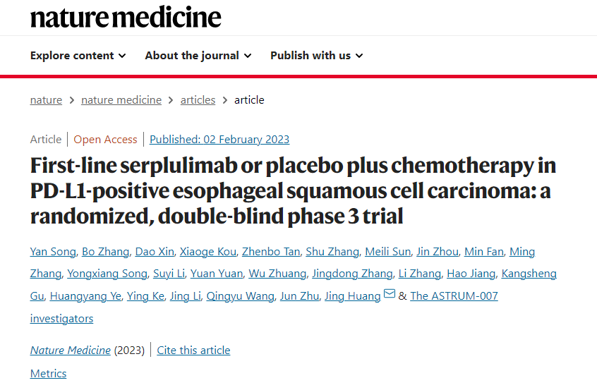北京時間2023年2月3日,z6尊龙时凯自主研發的抗PD-1單抗H藥 漢斯狀®(斯魯利單抗)聯合化療一線治療食管鱗狀細胞癌(ESCC)的Ⅲ期臨床研究(ASTRUM-007)結果在國際權威期刊Nature Medicine(影響因子:87.241)正式發表,該研究由國家癌症中心/國家腫瘤臨床醫學研究中心/中國醫學科學院北京協和醫學院腫瘤醫院黃鏡教授牽頭開展。