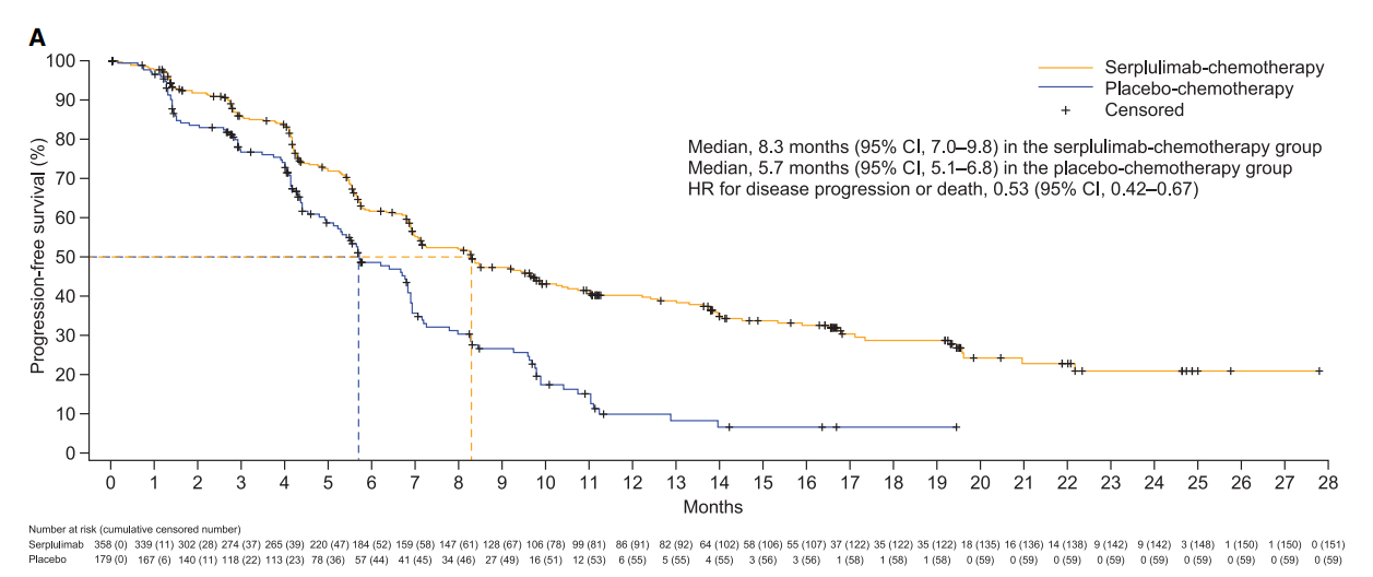 ASTRUM-004是一項隨機、雙盲、國際多中心Ⅲ期研究,旨在研究斯魯利單抗對比安慰劑分別聯合化療在既往未接受治療的晚期sqNSCLC患者中的療效和安全性。截至2023年1月31日,537例患者以2∶1的比例隨機分組,兩組患者分別接受靜脈輸注斯魯利單抗4.5 mg/kg或安慰劑(最多35個周期)聯合化療(卡鉑和白蛋白紫杉醇,4-6個周期),每三周為一個周期。無進展生存期(PFS)的更新分析顯示,中位隨訪時長為16.9個月時,斯魯利單抗-化療組相對於安慰劑-化療組在中位PFS上持續獲益【IRRC評估的中位PFS,8.3 vs. 5.7個月;風險比(HR)0.53,95% CI 0.42-0.67】。在預設的各亞組分析中,斯魯利單抗-化療組在PFS的HR值上均展現出優勢。總生存期(OS)的最終分析顯示,中位隨訪時長為31.1個月時,治療方案中添加斯魯利單抗顯著延長了中位OS(22.7 vs. 18.2個月;HR 0.73,95% CI 0.58-0.93;P=0.010,達到了顯著性閾值0.046)。截至最終分析時,已有97名(54.2%)安慰劑-化療組患者轉為接受斯魯利單抗治療。經兩階段模型調整後的安慰劑-化療組中位OS為11.5個月(95% CI 9.6-13.5),斯魯利單抗-化療組相對於安慰劑-化療組的HR為 0.49(95% CI 0.37-0.64)。安全性方面,斯魯利單抗聯合化療的安全性良好。與單純化療相比,在未經治療的局部晚期或轉移性sqNSCLC患者中,斯魯利單抗顯著改善了生存期,且安全性可控。對於這一患者人群,斯魯利單抗聯合化療將是一種非常有前景的治療方案。