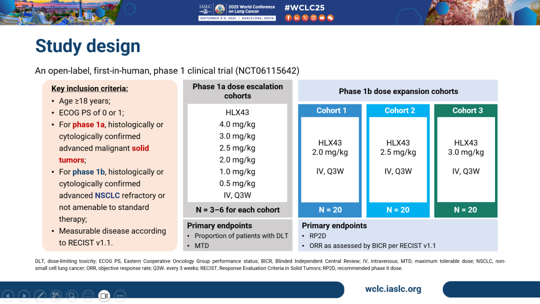 此次發佈的更新研究數據來自一項開放標籤、評估HLX43(抗 PD-L1 ADC)在晚期/轉移性實體瘤患者中的安全性、藥代動力學特徵和初步療效的首次人體 I 期臨床研究(本次更新NSCLC人群數據)。研究包括Ia(劑量遞增)的Ib期(劑量擴展)兩個階段。在Ia期中,組織學或細胞學確診為晚期/轉移性惡性實體瘤且對標準治療無效或無法接受標準治療的患者接受每三周一次(Q3W)0.5 mg/kg、1 mg/kg、2 mg/kg、2.5 mg/kg、3 mg/kg或4 mg/kg HLX43靜脈注射。在Ib期中,對標準治療無效的晚期/轉移性NSCLC患者給與2mg/kg、2.5 mg/kg或3 mg/kg HLX43 (Q3W) 靜脈注射,Ib期的主要終點為推薦的II期劑量(RP2D)和客觀緩解率(ORR)。