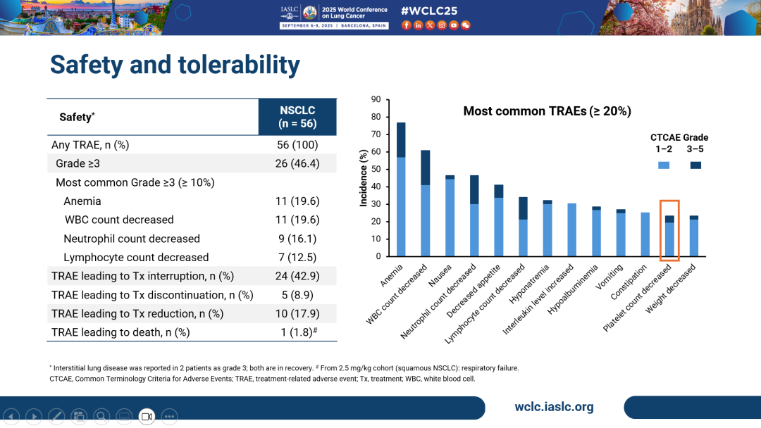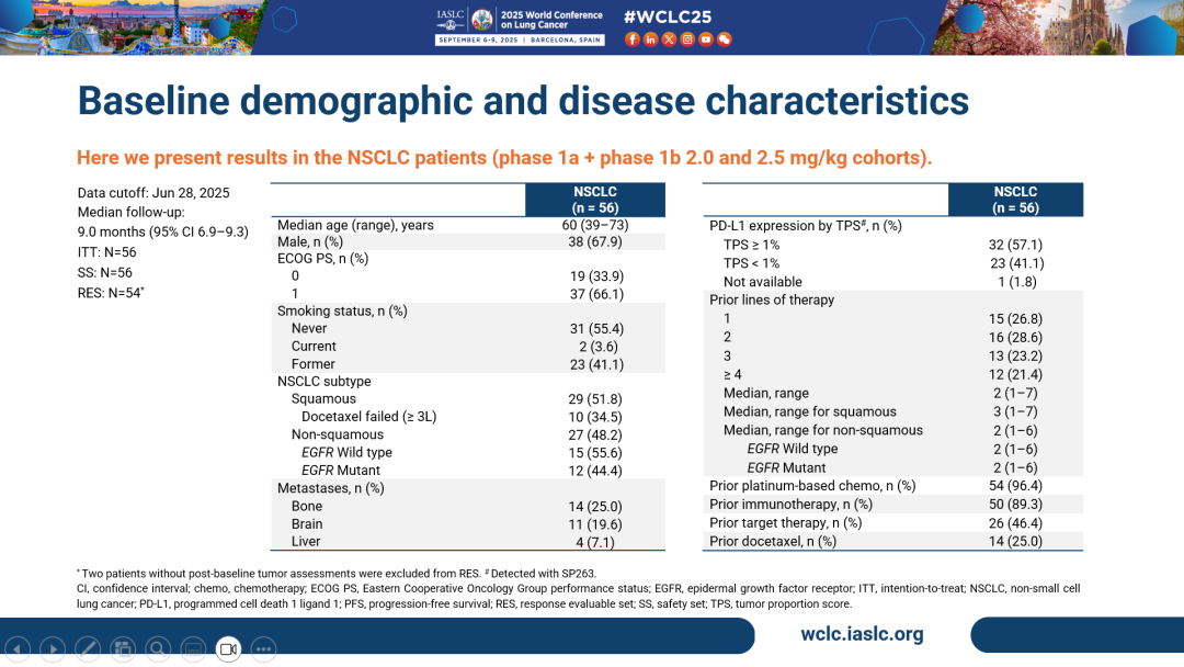 截至數據截止日期2025年6月28日,共計56例NSCLC患者入組Ia期及Ib期2.0和2.5 mg/kg劑量組,其中29例(51.8%)為鱗狀,27例(48.2%)為非鱗狀。鱗狀NSCLC中,10例(34.5%)患者經多西他賽治療失敗。非鱗狀NSCLC中,EGFR野生型/突變患者分別為15例(55.6%)及12例(44.4%)。