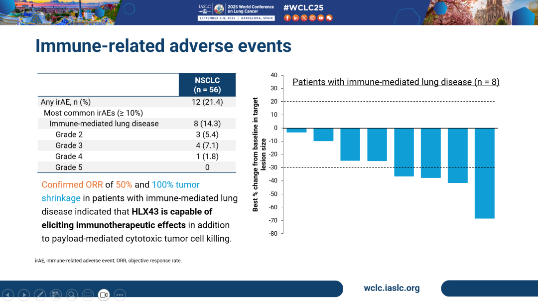 同時,在發生免疫相關性肺病的患者人群中觀察到更高的治療獲益,包括50.0%的cORR 及100%的腫瘤縮小率,提示HLX43可能「雙管齊下」,其療效經由小分子毒素以及免疫機制介導。