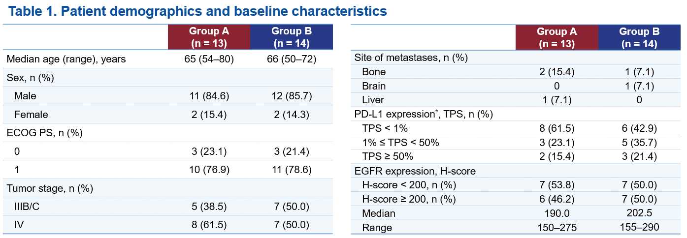 截至2025年3月5日,共有27例患者參與並隨機分配至研究第3部分的A組(n=13)或B組(n=14)。兩組患者分別每三周一次接受800 mg HLX07(A組)或1000 mg HLX07(B組)聯合300 mg斯魯利單抗和化療。15例(55.6%)患者患有轉移性sqNSCLC。中位隨訪時間為18.6個月。