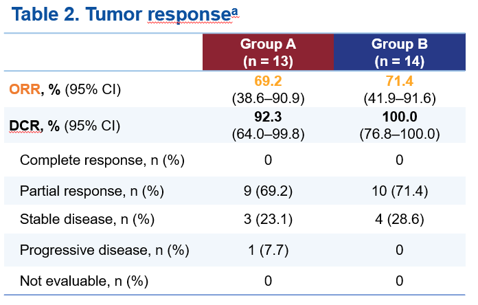A組和B組中,獨立影像評估委員會(IRRC)根據RECIST 1.1評估的確認ORR分別為69.2%(95% 置信區間[CI] 38.6–90.9)和71.4%(95% CI 41.9–91.6),疾病控制率分別為92.3%(95% CI 64.0–99.8)和100%(95% CI 76.8–100.0)。
