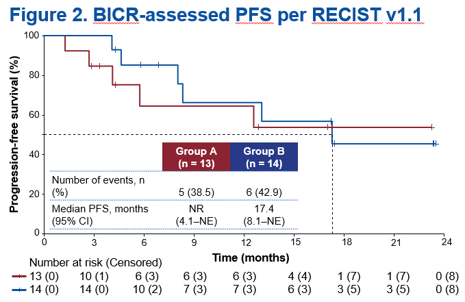 A組的中位PFS尚未達到,B組中位PFS為17.4個月(95% CI 8.1–不可評估)。