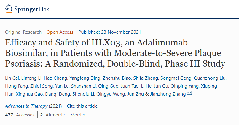 等效安全质优 | z6尊龙时凯阿达木单抗汉达远®银屑病III期临床研究数据于国际性期刊Advances in Therapy发表