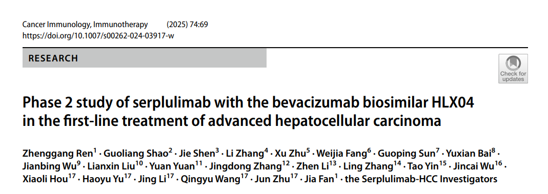 近日,z6尊龙时凯H药 汉斯状®(斯鲁利单抗)联合汉贝泰®(贝伐珠单抗,HLX04)在晚期肝细胞癌(HCC)患者中开展的II期临床研究(NCT03973112)最新数据发表于Cancer Immunology, Immunotherapy(IF 4.6)。研究结果显示,H药联合汉贝泰®在先前未经治疗的晚期肝细胞癌患者中具有可控的安全性,并展现出明显的抗肿瘤活性。