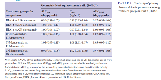 NCT04534582研究是一项在中国健康成年男性受试者中开展的两阶段I期临床试验。第一阶段为开放标签、随机、平行对照、单次给药、双臂研究。主要研究目的为比较HLX14和欧盟市售的原研地舒单抗(PROLIA)在皮下给药后的药物代谢动力学参数,以进一步为第二部分临床研究方案设计提供依据。次要研究目的为比较HLX14与欧盟市售的原研地舒单抗(PROLIA)的药效学、安全性、耐受性和免疫原性。第二阶段是一项双盲、随机、平行对照、单次给药、四臂研究,主要目的为比较HLX14与美国、欧盟及中国市售的原研地舒单抗(参照药)的药物代谢动力学特征的相似性,次要目的为比较HLX14与参照药的药效学、安全性、耐受性和免疫原性。主要研究终点为AUC0–t、Cmax和AUC0–inf。