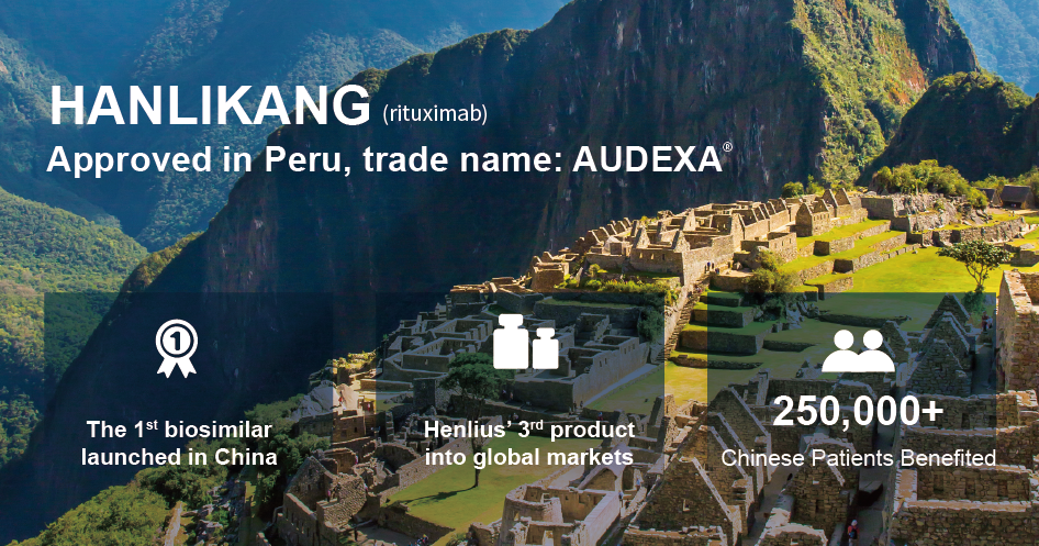 Recently, HANLIKANG (rituximab), independently developed and manufactured by Henlius, has been approved to be marketed in Peru under the trade name AUDEXA® by the Dirección General de Medicamentos, Insumos y Drogas (DIGEMID). HANLIKANG is the third product that has been developed and manufactured by Henlius independently and approved for overseas marketing, following HANQUYOU and HANSIZHUANG. As China's first biosimilar, HANLIKANG has so far benefited over 250,000 Chinese patients since its launch in 2019.