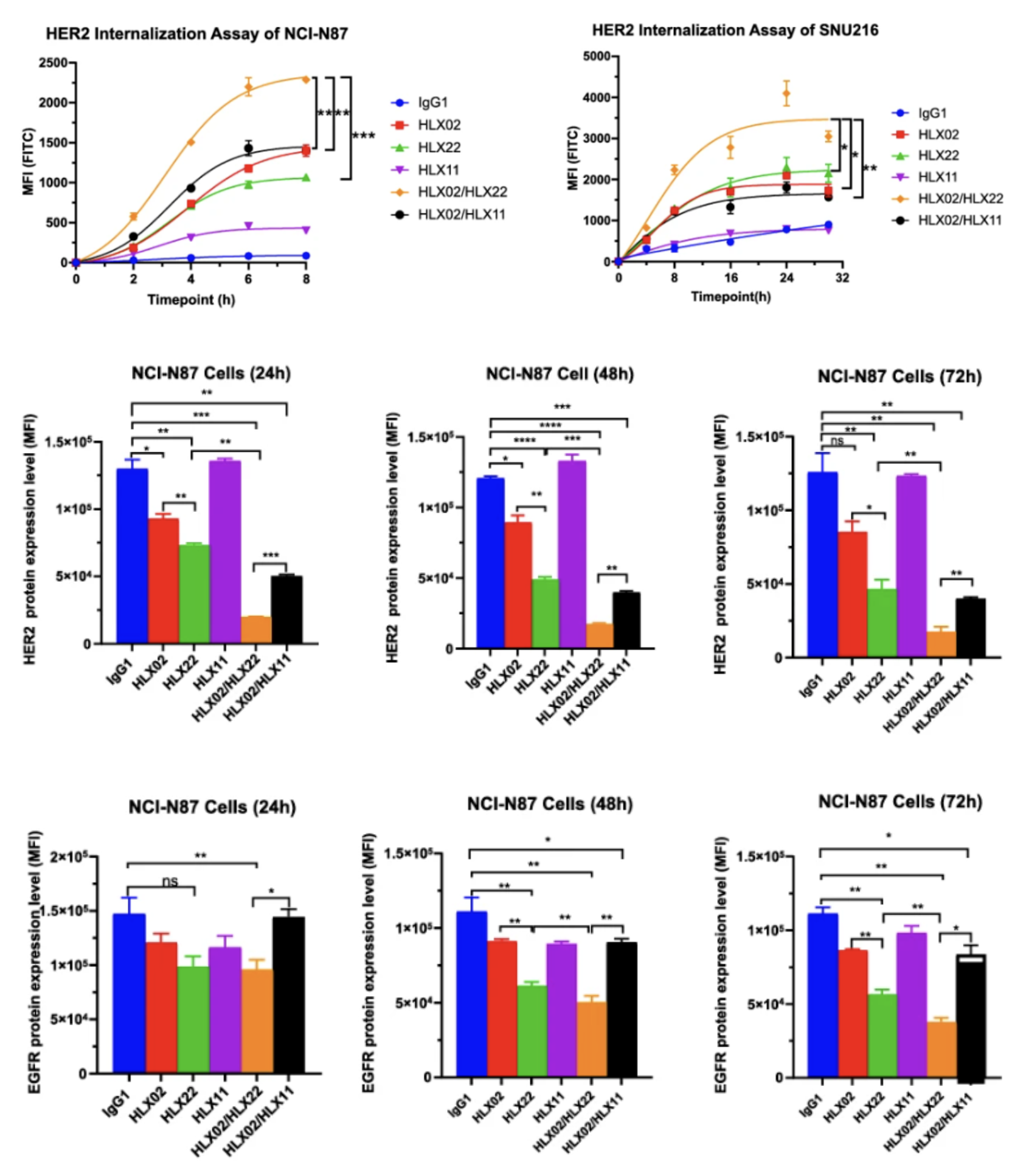 Epidermal growth factor receptor (EGFR) family signaling contributes to neoplastic cell growth, malignant transformation, and resistance to chemotherapy[1]. Human epidermal growth factor receptor 2 (HER2) belongs to human EGFR family, including EGFR (HER1), HER3, and HER4. Upon ligand binding, the EGFR family members can homodimerise or heterodimerise with each other to form several receptor complexes. The dimerisation of EGFR family members results in protein phosphorylation on their intracellular domain that activates intracellular signaling cascades, which ultimately promote the expression of target genes that regulate various cellular processes influencing growth, proliferation, migration and survival[2,3]. Remarkably, HLX22 and trastuzumab (HLX02) simultaneously bound to HER2 subdomain IV and promoted HER2/HER2 homodimer internalisation and HER2/EGFR heterodimer internalisation, resulting in a 40%–80% increase in HER2 internalisation. In contrast, pertuzumab disrupted the formation of HER2 heterodimer. Therefore, trastuzumab (HLX02) and HLX11(pertuzumab biosimilar) combination disrupted HER2/EGFR heterodimer formation. Consequently, trastuzumab (HLX02) and HLX11(pertuzumab biosimilar) combination only promoted HER2 internalisation but could not promote EGFR internalisation together. This might be one of the reasons why trastuzumab and pertuzumab combination failed in gastric cancer clinical trial.