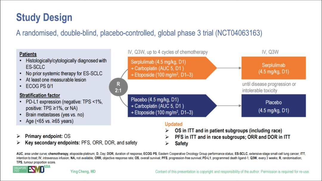 患者按照2:1的比例随机分配至实验组和对照组,两组治疗方案分别为斯鲁利单抗或安慰剂(4.5mg/kg,D1)+ 卡铂(AUC 5,D1)+ 依托泊苷(100 mg/m2,D1-3),静脉输注,每 3 周一次,最多4个治疗周期,序贯斯鲁利单抗(4.5 mg/kg,D1,3周1次)维持治疗,直至疾病进展或不可耐受的毒性。研究的主要终点为OS,次要终点包括PFS、ORR、DoR和安全性等。(见图1)
