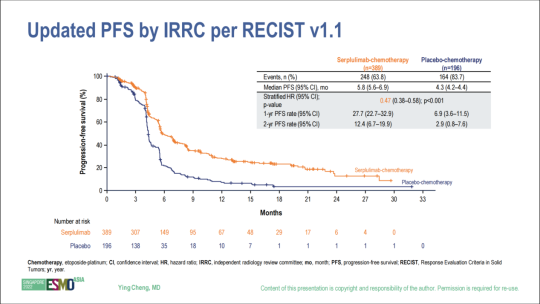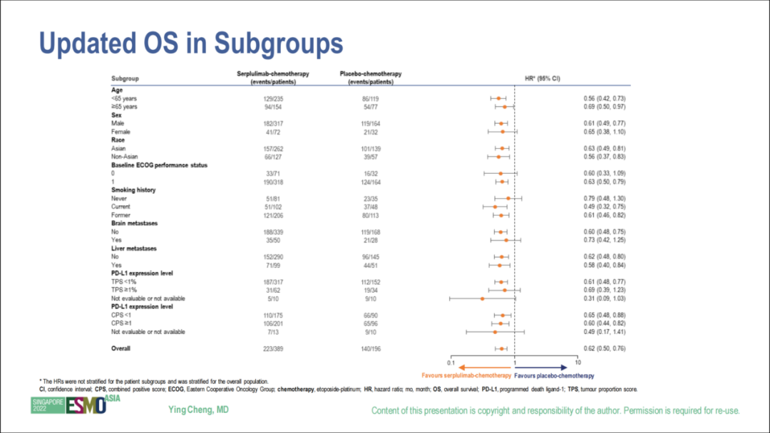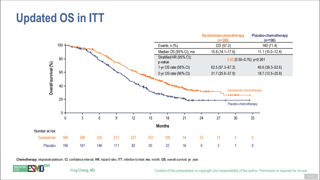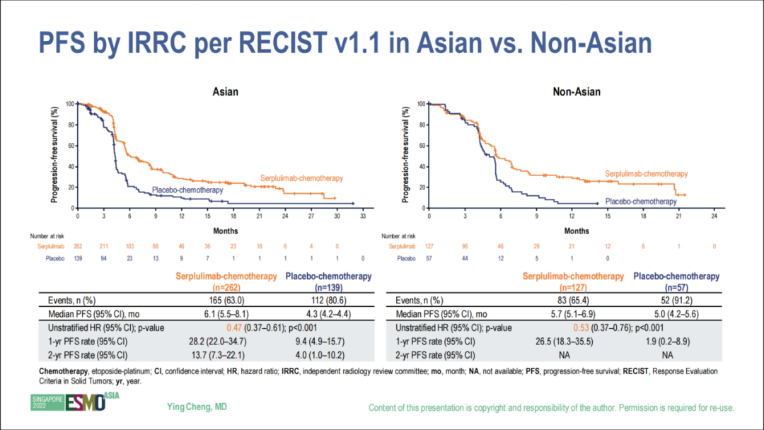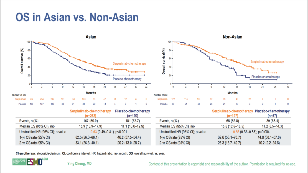 此前ASCO 2022大会上公布的是中位随访12.3个月的结果,此次ESMO ASIA 2022更新的是中位随访19.8个月的结果,并增加了对亚裔人群和非亚裔人群的OS、PFS分析。