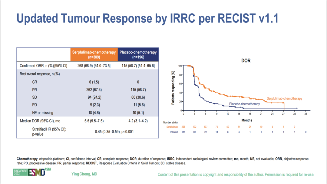 ORR 、DoR 显著改善:此次公布的是确认的 ORR 分析结果 ( 图7 ) ,68.9% ( 268 / 389 ) 的患者确认从斯鲁利单抗联合化疗中获得肿瘤缓解,较对照组提升  10.2 %,且其中6例达到完全缓解 ( CR ) ,显示出较强的治愈潜力;对照组均为部分缓解 ( PR ),无 CR 病例。斯鲁利单抗联合化疗组的DoR同样优势明显,中位 DoR 更长(6.5 个月 vs 4.2 个月,HR = 0.45,95% CI: 0.35~0.59 ),展现了持久的肿瘤缓解能力。